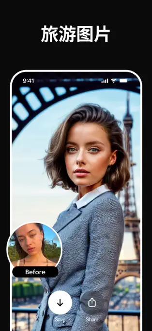 - 旅行照片生成:生成在世界各地的旅行照片,如埃菲尔铁塔、圣托里尼岛等。