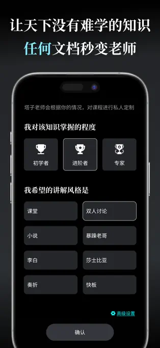 - 专属风格定制:用户可以根据自己的喜好选择讲解风格、音色和难度,从“严谨课堂”到“暴躁老哥”,从“阳光甜妹”到“智慧大爷”,可以选择文坛巨匠为你讲解。
