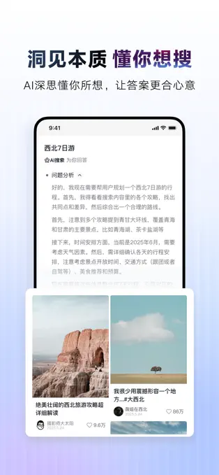 深度思考与搜索:AI抖音APP具备深度思考能力,能结合全网信息,快速提供详细的文字答案和双列展示的图文视频内容。
