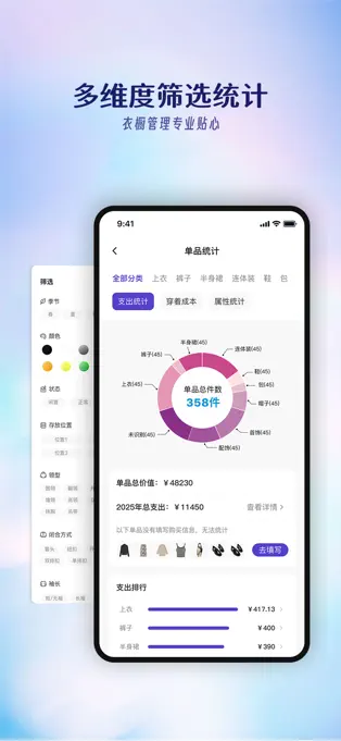 - 多级分类与筛选:可灵活管理衣物,支持多维度筛选,方便查找。