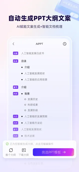 AI一键生成:基于人工智能技术,输入主题或文档资料,即可快速生成高质量PPT。