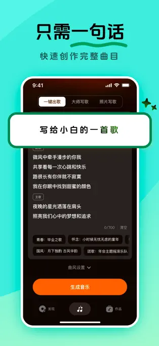 照片写歌:上传照片,AI解析内容后创作契合情境的歌曲,将视觉与音乐完美结合。
