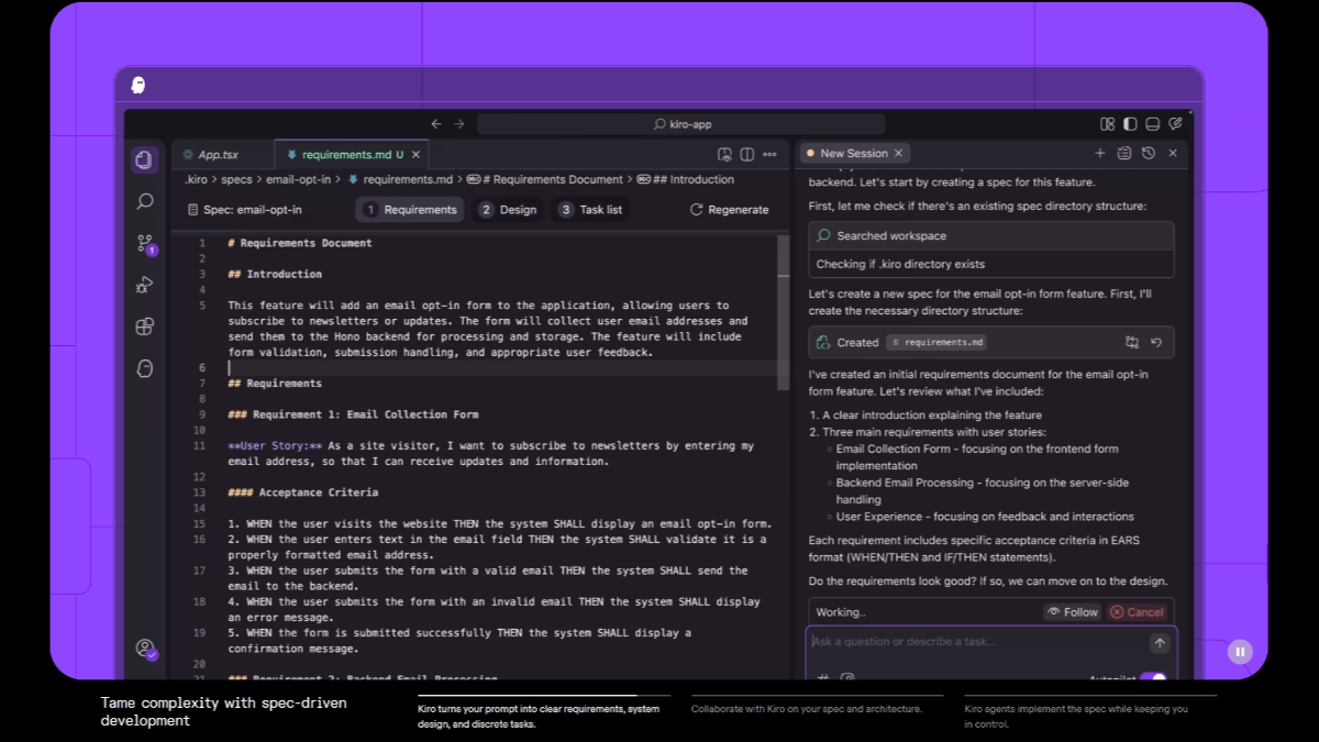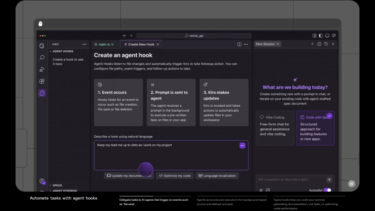 Kiro 是亚马逊推出的创新型 AI 驱动的集成开发环境(IDE)。Kiro 基于 Specs 和 Hooks 两大核心模式简化开发流程。Specs 先聊天再构建,将需求分解为用户故事、设计文档和技术任务,让开发目标明确且可追溯;Hooks 先规划再构建,通过事件驱动自动化,自动完成测试更新、文档刷新等重复性任务,提升开发效率并减少错误。Kiro支持多种主流编程语言,兼容 VS Code 设置,无缝融入现有开发环境,为开发者提供高效、智能的编程体验。Kiro目前处于预览阶段,完全免费,是开发者快速交付项目的得力助手。