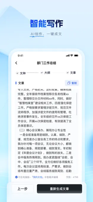 公文写作:提供述职报告、工作总结、心得体会、领导讲话等多文种写作功能,能校对润色、生成高质量提纲。