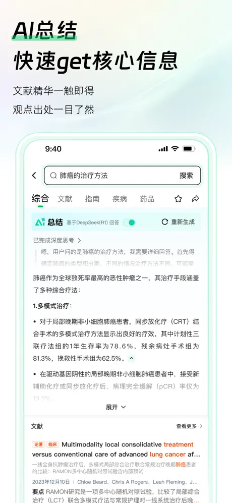 - AI 搜索:通过自然语言搜索功能,用户输入完整句子进行查询,系统高效整理文献信息并确保观点可溯源,同时满足临床医学工作者对最新文献的周期性查询需求及对特定领域系统性综述的需求。