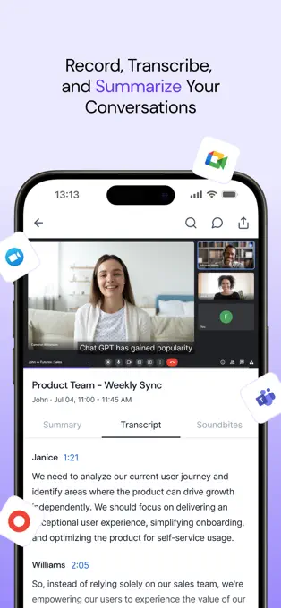自动录制与转录:能跨多种视频会议应用(如 Zoom、Google Meet、Teams 等)自动录制并转录会议内容,生成文字记录。
