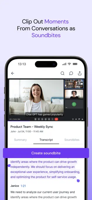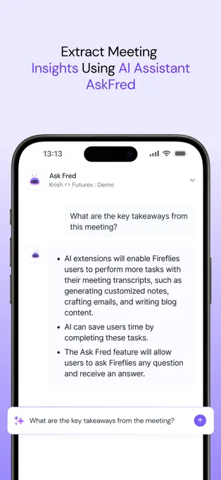 团队协作:支持创建精彩片段(soundbites),轻松分享会议中的重要时刻。可以通过 AskFred 功能回答问题、总结关键内容或创建相关内容,将笔记发送到 Slack、Notion、Asana 等协作工具。