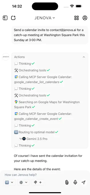 集成多种任务:用户可以通过 Jenova 发送邮件、设置日历事件以及编辑文档,将多种常用功能集成在一个应用中,方便高效地完成工作。