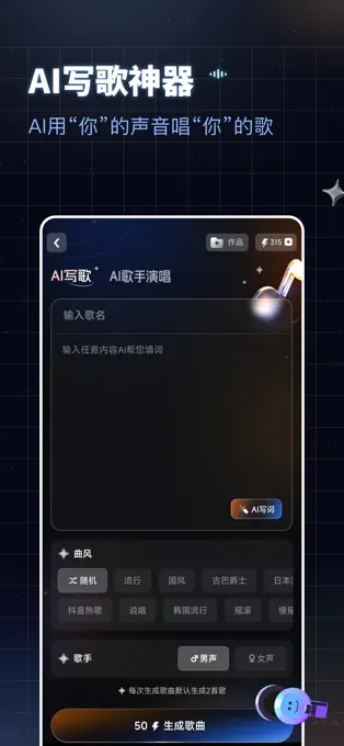 AI写歌:输入歌词类型和演唱风格,AI助手创作个人单曲,轻松变身唱作人。