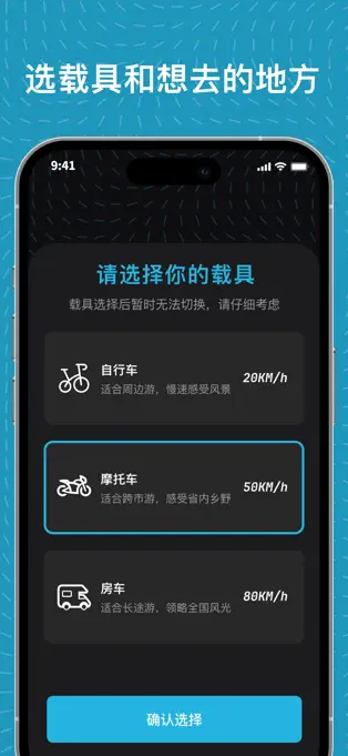 选择载具:提供多种载具选择,如自行车、摩托车、房车等。App会根据载具的移动速度模拟行程,让用户感受真实的旅行过程。