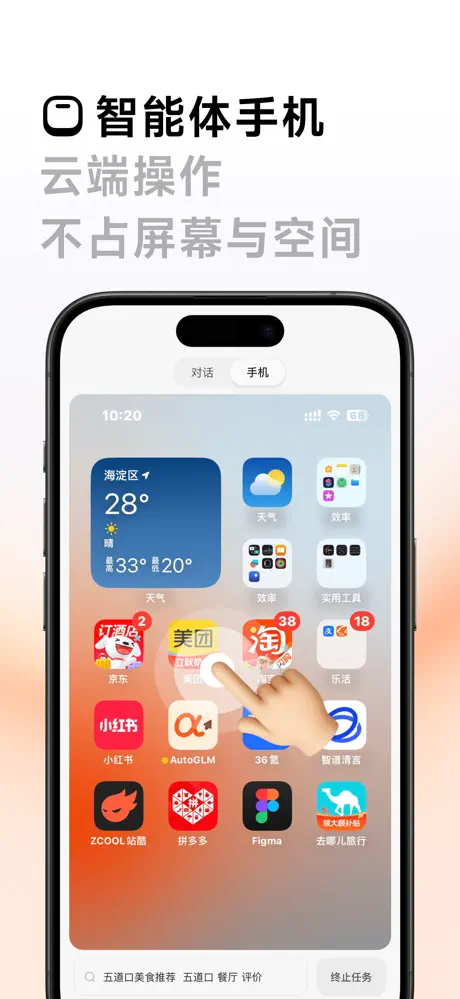 - 自动化任务执行:自动完成移动端App操作、跨App交互及网页任务执行。支持打开App、浏览网页、点外卖、订酒店、制作PPT和网页、生成视频等任务。