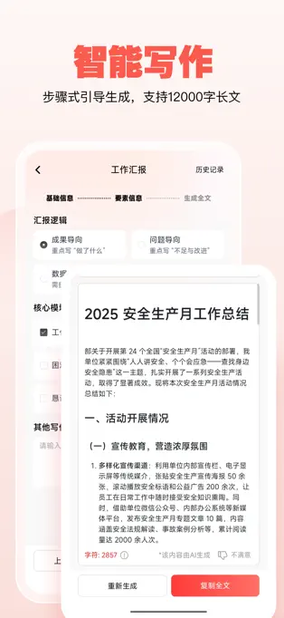 AI写作 :输入主题即可一键生成权威、规范的公文初稿,涵盖多种公文类型,如发言稿、会议纪要等,支持最高 12000 字长文输出。