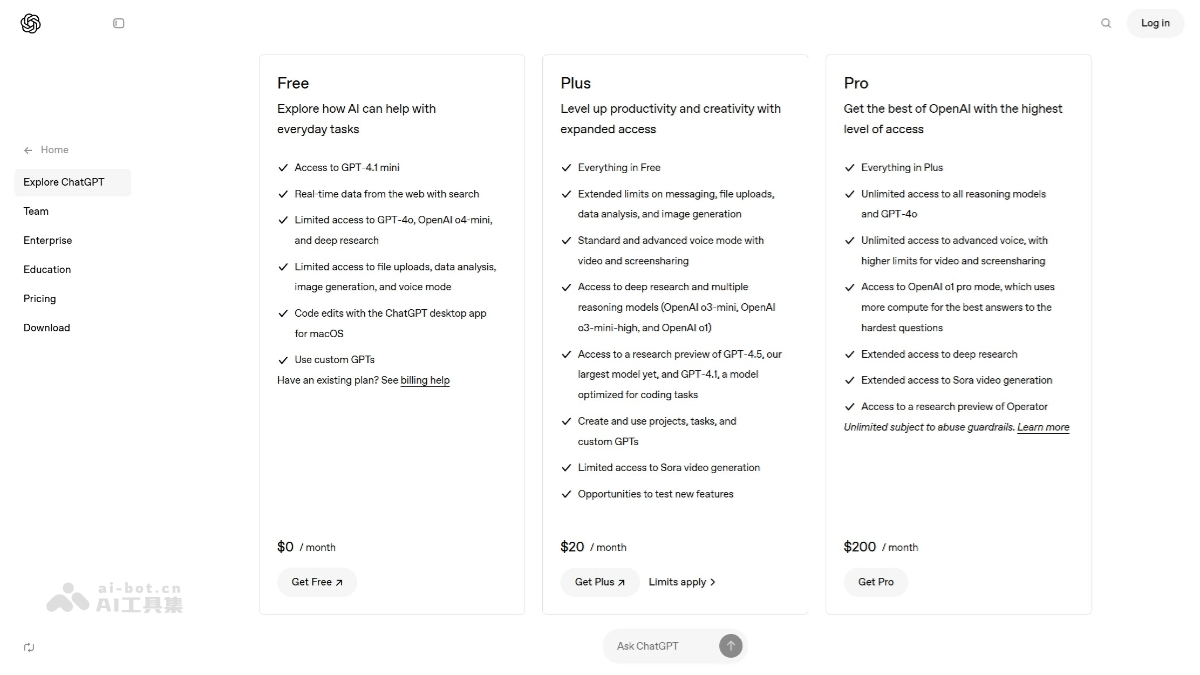 - Free(免费)适合基本用户,提供有限的AI功能和访问权限。