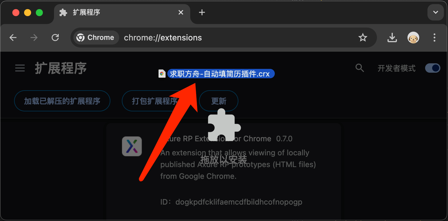 - 安装插件文件:将下载的zip文件“解压缩后”,找到其中的“crx文件”拖入扩展程序页面。